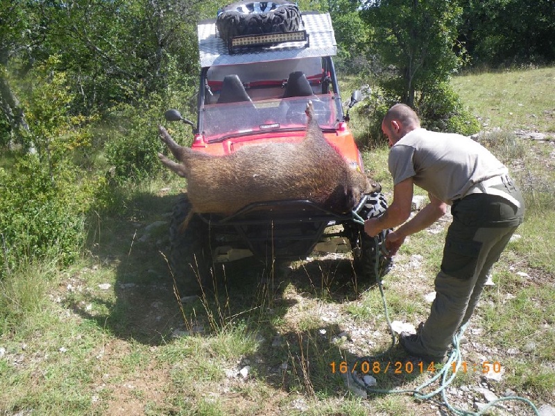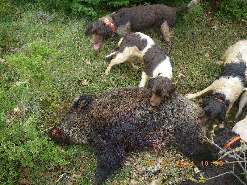 Chiens à la chasse Parsons et Kopov après la bataille Hardy blessée , n'avait qu'à faire gaffe ... Baxter au faisan . Dara l'a chopé toute seule au départ , après , ça a été la curée ... Celui-là , ils l'ont un petit peu machouillé derrière les oreilles... Celui-là aussi , on l'a un petit peu machouillé ... Ares et Dara se sont régalé en Sologne . Dara belle comme tout dans la traque ... L'équipe sur un gros qui est mort à 300 mètres du gite . Qui croirait qu'on est au gros gibier ? Urielle , " Mumu " , au retour , rincée défoncée de fatigue ... Hieros , premier sanglier ? Non non , c'est le deuxième . Les deux Parsons et le kopov samedi dernier sur un 85 kilos . Biche tuée devant le nez . Renard blessé attrapé . Cerf retrouvé en recherche avec Circé ma Rouge de Hanovre . . Petit sanglier " cravaté " sur l'Aubrac . On ne tue pas que des petits ... Renard qui n'a pas souffert ... Tableau avec les munsters sur l'Aubrac. L'équipe à la piscine , en cours de traque au Calmels ... Le guerrier , à la descente du ring . Beau sanglier, tué le long de la clôture . Au Calmels il se tire aussi des mouflons en battue . Dara heureuse d'être à la chasse avec son frère Baxter et son ami Roki Fleur , première séance et déjà contente de se pendre après les petits Flèche de retour du boulot . Fleur au mouflon , beaux cornus tirés en battue . Jeunes traqueurs au Calmels , des durs . Celle qui m'a mordu , pas blessée , 70 kilos . Même morts , on les prend par l'arrière ! Il y a des sangliers dans le sud ! Chasses d'été dans le sud , au milieu des genêts en fleurs . Le quad , pratique pour remonter le sanglier . Mâle de 52 kilos vidé , 65 plein , pas abimé par la balle , pris ... Blessé au coude , attrapé sans discussion . Baxter est revenu à son niveau , seules deux canines lui manquent . Celui du milieu , 68 kilos , c'est mes chiens qui l'ont pris . Celui là , ils ont juste servi à le trouver , mort ... Goupil coupé en deux , par la balle . Je viens de piquer celui de 40 kilos pour Pâques . La grosse , 80 kilos . Dara était du côté du bon coup de dague . Il était " outillé " . Pâques au Calmels , 28 sangliers et 3 daims . Ceux là , j'aime autant que les chiens me les laissent ... Pierre dubitatif devant le bestiau qui voulait le choper . Qu'est ce qu'elle a , ma gueule ? Blessé de patte avant , pris par les chiens . 105 kilos , pris par les chiens . C'est limite quand même ... Repos bien mérité après l'effort . Piste de sang ? Percé comme il faut , ne risque pas d'aller bien loin Samedi à Laroque , et il en manque un , en trois grosses heures Lina Liska Dara , il aurait du se tailler ...